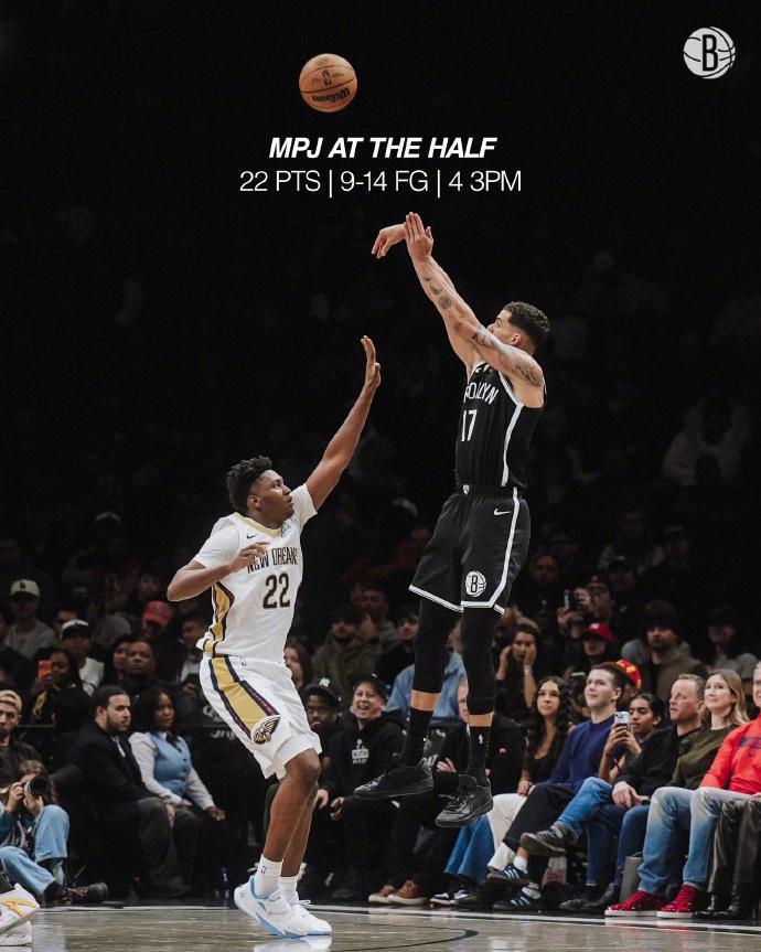 鹈鹕过去5场遭遇5连败,且前23场只有3胜20负位列联盟倒数第一,篮网上一场主场110-123输给爵士。本场篮网缺少托马斯与海史密斯,鹈鹕缺少锡安、穆雷、普尔与琼斯多位主力。首节比赛,篮网在前6分半钟仅14-13领先1分,篮网很快多点开花打出一波16-3攻势扩大13分优势,首节结束篮网35-24领先鹈鹕。