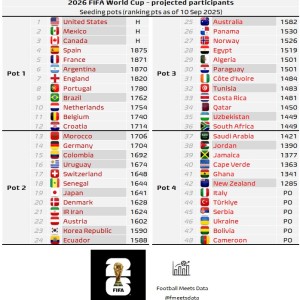 09月11日讯 9月份国际比赛日结束,足球数据媒体Football Meets Data更新了2026美加墨世界杯分档的...