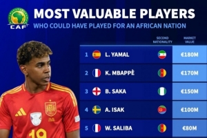 体育资讯3月27日讯 《转会市场》统计了当前第二国籍为非洲国家的球员身价榜单,亚马尔压姆巴佩居首。