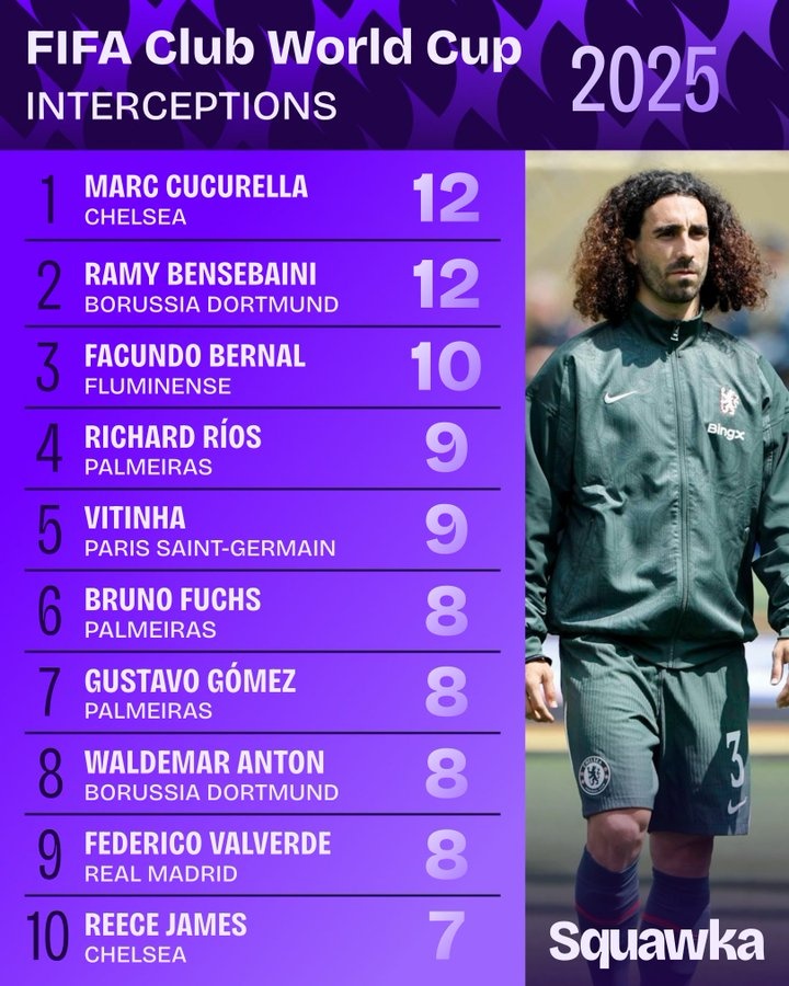 7月15日讯 Squawka统计了世俱杯赛事拦截次数排名,库库雷利亚和本塞拜尼12次并列第一。